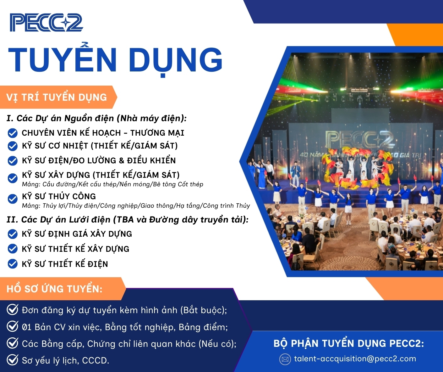 Trước nhu cầu mở rộng và đẩy nhanh tiến độ các dự án trọng điểm, Công ty Cổ phần Tư vấn Xây dựng Điện 2 (PECC2) đang triển khai đợt tuyển dụng nhiều vị trí kỹ thuật cho mảng nguồn điện và lưới điện. Đây là cơ hội để các kỹ sư tham gia vào những công trình năng lượng quy mô quốc gia, ứng dụng công nghệ hiện đại và tiêu chuẩn quốc tế.