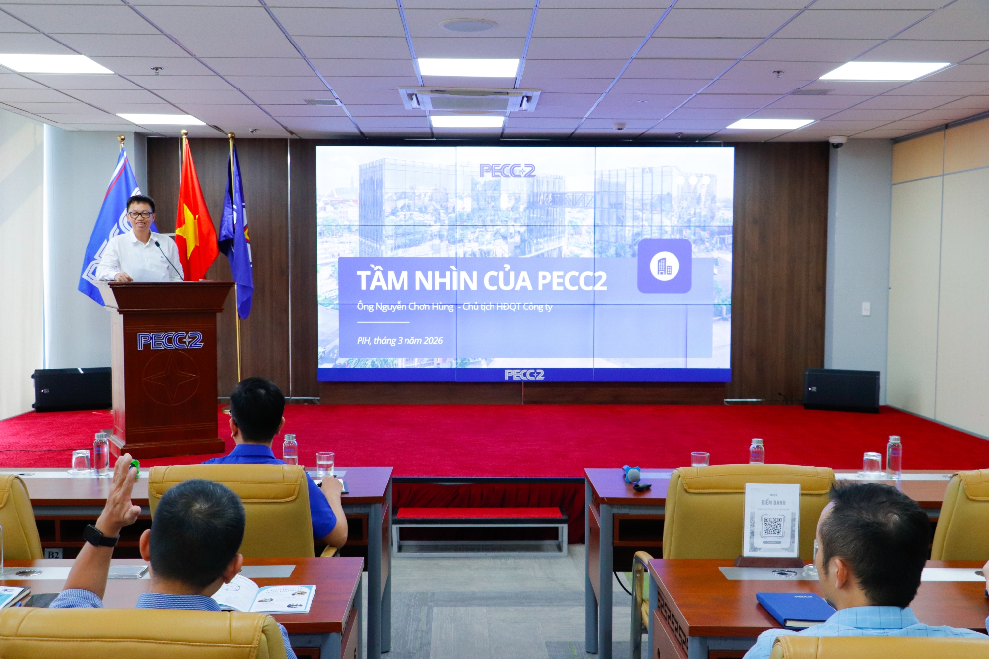 Thông qua phần chia sẻ của Chủ tịch, các nhân viên mới được tìm hiểu về lịch sử hình thành Công ty cùng những dấu mốc quan trọng trong hành trình 40 năm phát triển. Chủ tịch cũng giải thích về mô hình “3 vòng tròn chiến lược: Tư vấn - Kinh doanh - Đầu tư” để các nhân sự mới hiểu hơn về các lĩnh vực, ngành nghề kinh doanh và thế mạnh của PECC2. Từ đó, anh Hùng chia sẻ tầm nhìn, chiến lược và những hành động cụ thể của PECC2 trong thời gian tới.